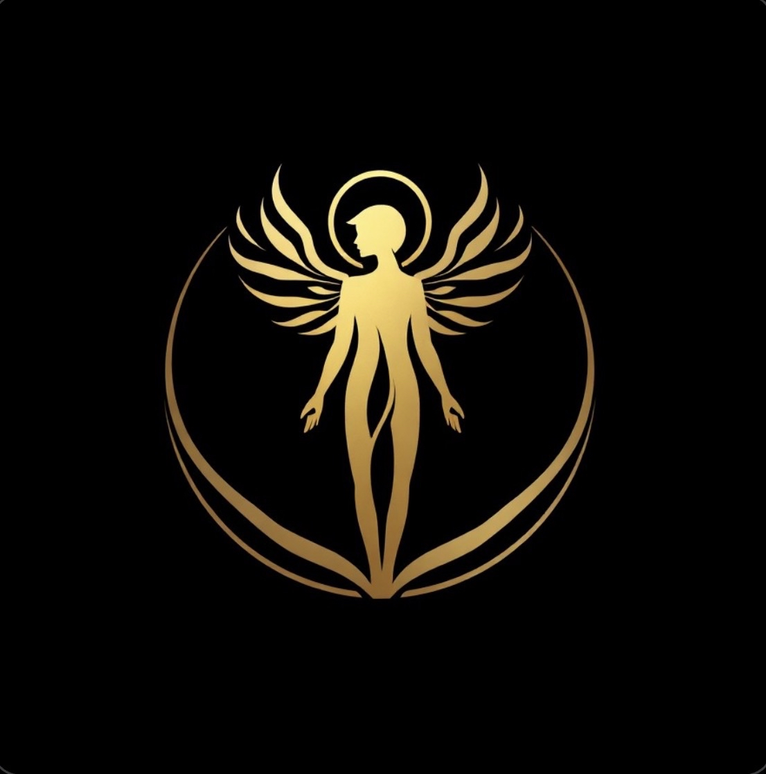 A golden figure rising with wings spread, halo glowing, arms open in welcome and protection. Enclosed within a shield that comes to a point below — like a seed, a flame, or a soul ascending.